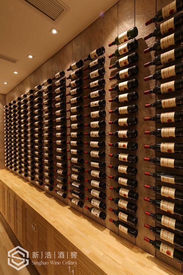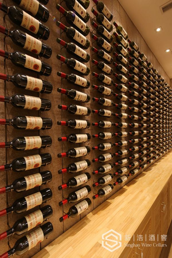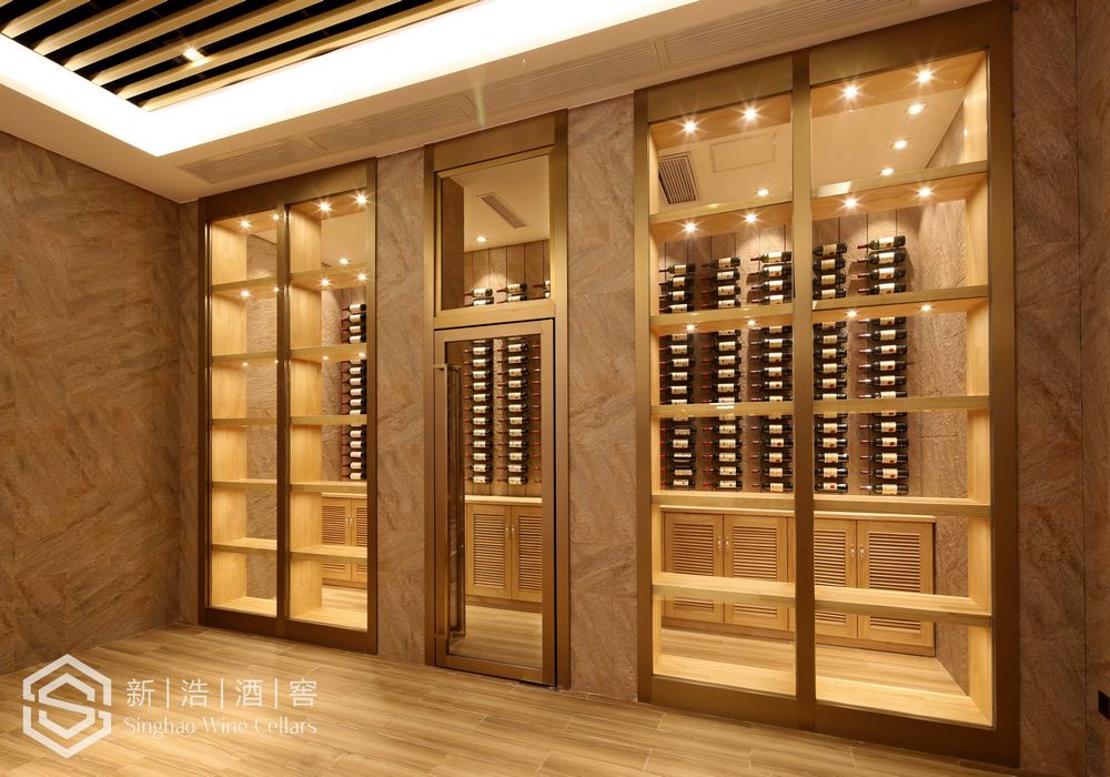 酒窖拥有3.5米天花标高,此酒窖的建成刷新了深圳市别墅地下室私藏酒窖的标高记录。墙壁上的金属拖架,将每一瓶佳酿完美的展现出来。金色拉丝不锈钢保温玻璃隔断使整个酒窖表现得更加时尚大气,也使地下室看起来更有空间感。